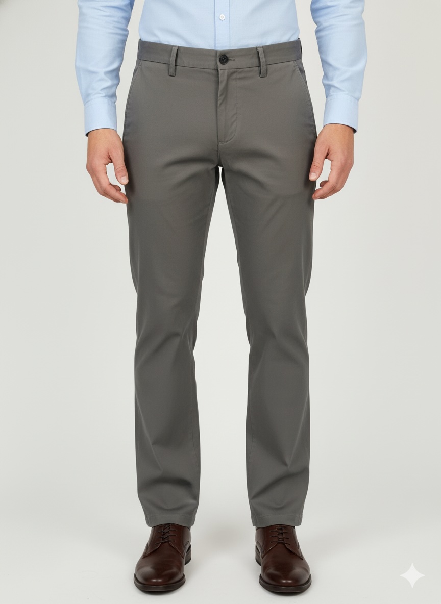 Prefer to traditional, tailored trousers designed for a professional appearance, typically in a solid color like black, grey, or navy, and made from fabrics suitable for corporate environments.